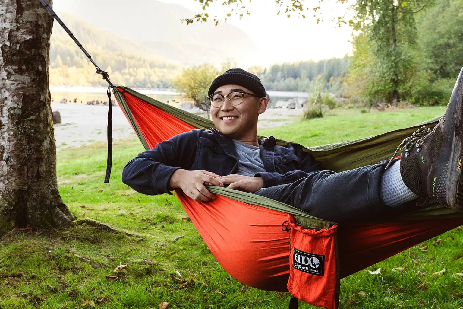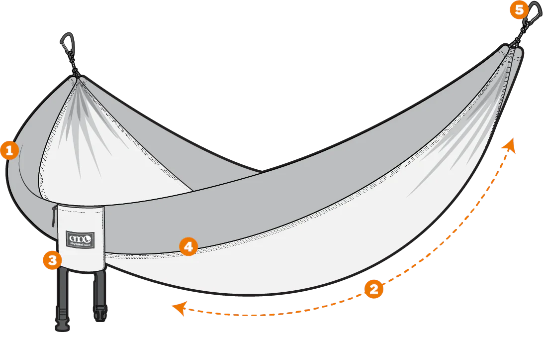 Adjust hammock and suspension system to reach a hanging height of 18in (45cm) or less from the ground. Gently lower yourself into the hammock and relax...