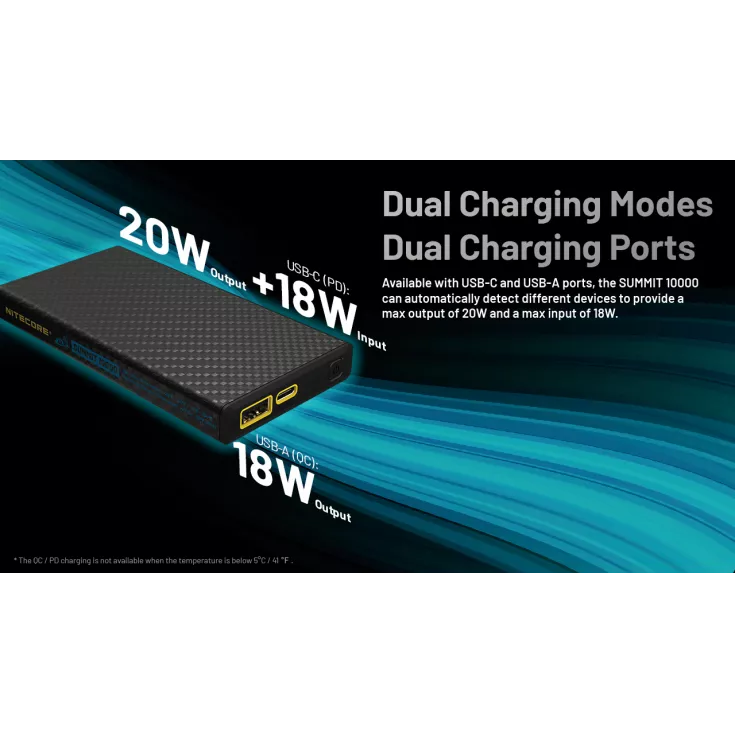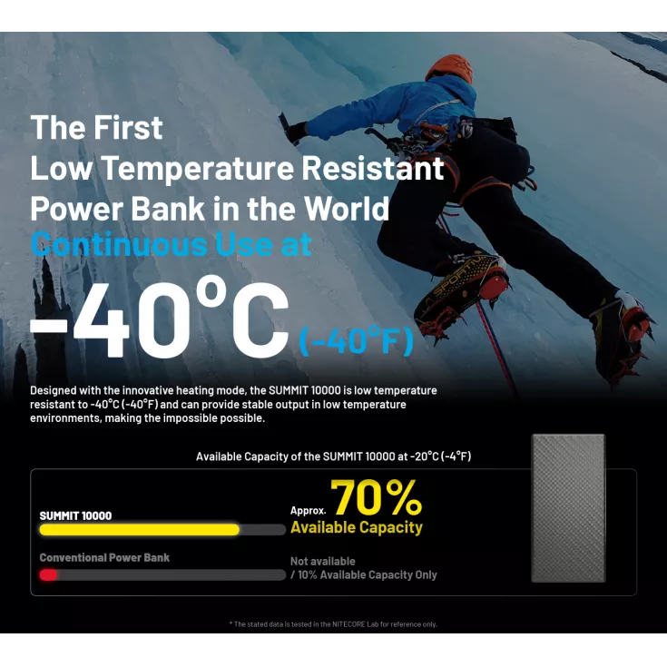 The Nitecore Summit 10000 is a low temperature resistant carbon fibre power bank, offering continuous use in temperatures as low as -40ºC. It has a large capacity of 10,000mAh which provides sufficient power for smartphones, headlamps, earphones and other electronic devices.
