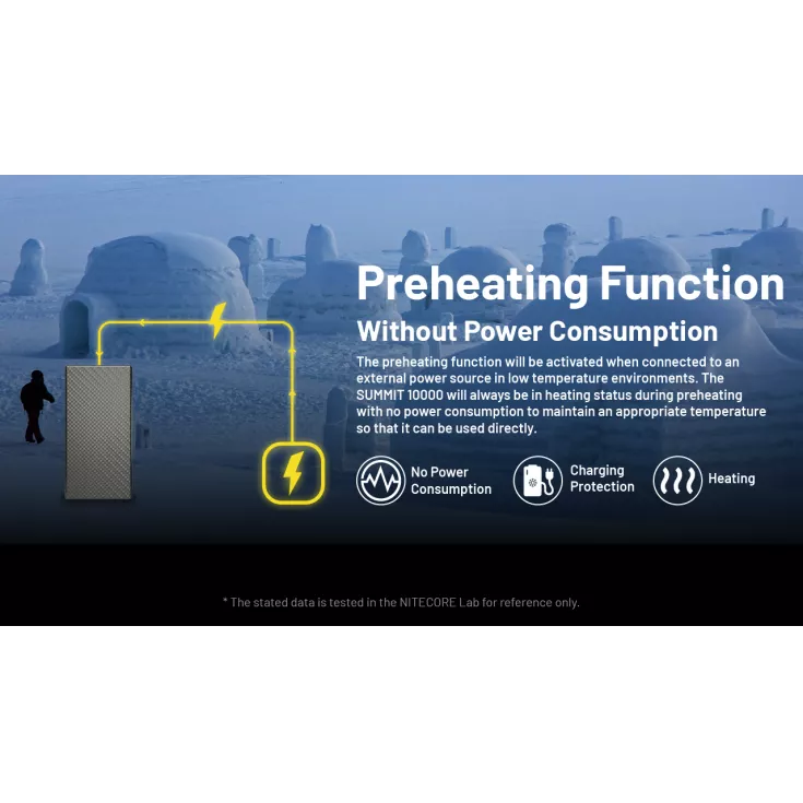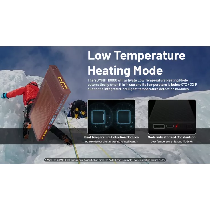 Equipped with a PI heating system, the Nitecore Summit 10000 has high efficiency and high speed heating performance which ensures that the battery can work at an appropriate temperature to allow for the reduced loss of power. The carbon fibre structure also guarantees thermal insulation in low temperature environments. The dual temperature detection modules automatically detects the temperature and activates the low temperature heating mode accordingly. The red mode indicator will illuminate when the mode is on.