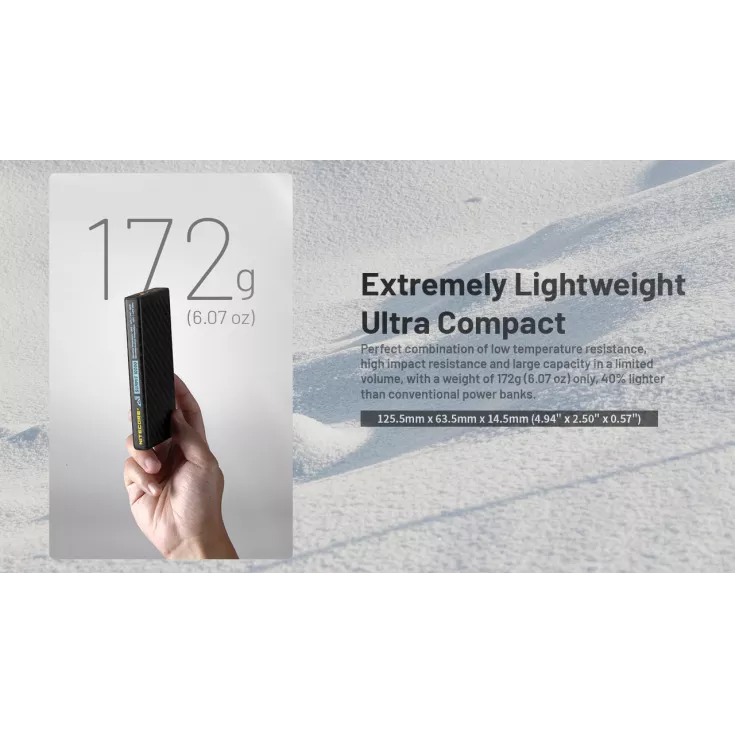Designed to help you reach your summit, the Nitecore Summit 10000 is ideal for mountaineering, polar exploration, time-lapse photography, skiing and other winter sports. It is made from a unibody carbon fibre shell without splicing, providing optimal protection. The Nitecore Summit 10000 is the perfect combination of low temperature resistance, high impact resistance and large capacity in a compact size that weighs just 172g.